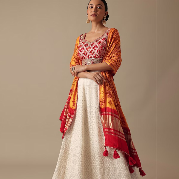 White, red & yellow embellished lehenga choli with dupatta,